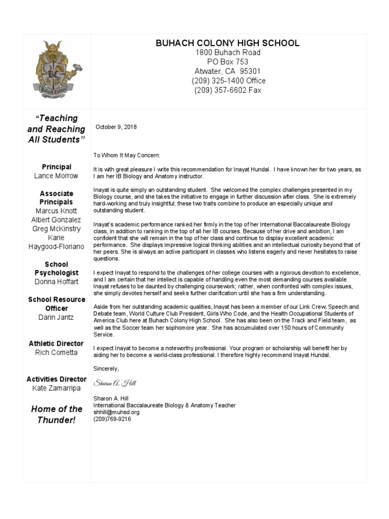 Letter Of Rec For Inayat Hundal Psychology Cognition