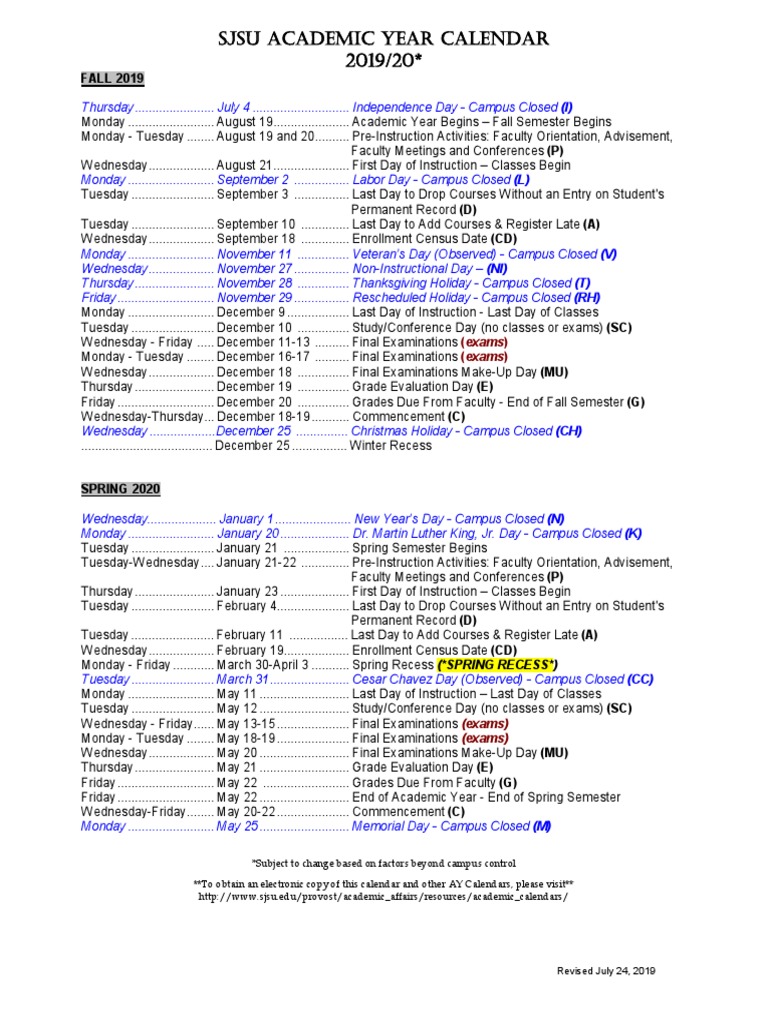 Fall 2021 Academic Calendar. A calendar makes it potential to do that. San José State University online acadmic catalog a comprehensive source for current information on academic programs policies degree requirements procedures and course offerings. Students must have completed 60 units in order to enroll in SJSU Studies courses.